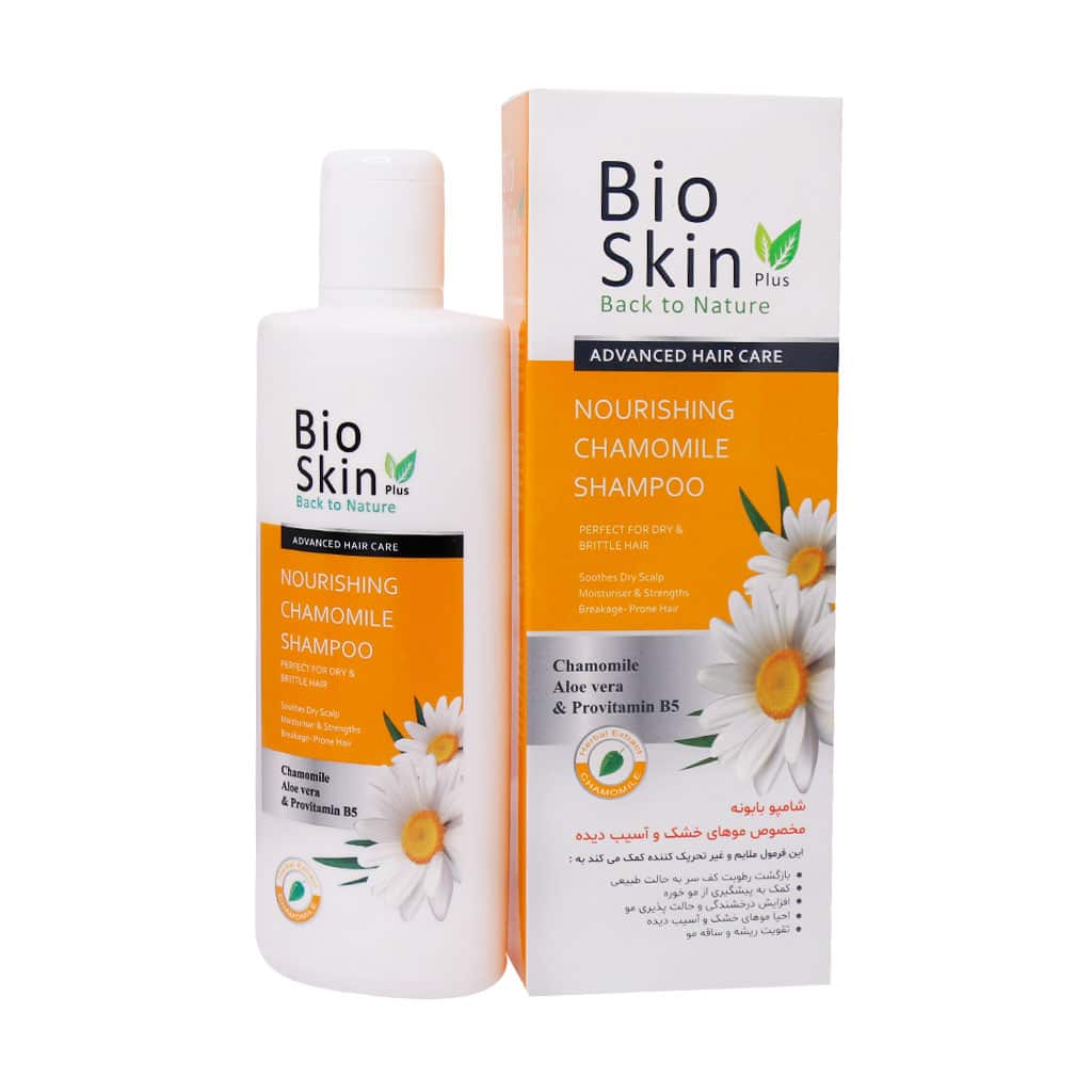 شامپو بابونه موهای خشک بایو اسکین پلاس یک شوینده ملایم موی سر است که بدون تحریک پوست کف سر، موها را از انواع آلودگی پاک میسازد. این محصول ریشه و ساقه مو را تقویت کرده و از بروز موخوره جلوگیری میکند. شامپو موهای خشک بایو اسکین پلاس موجب بازگشت رطوبت کف سر به حالت طبیعی خود شده و از خشک شدن تارهای مو جلوگیری میکند. همانطور که میدانید مو به دلایل متعددی همچون استفاده زیاد از سشوار و اتو مو، دکلره مکرر، شنا در آبهای کلردار، مصرف داروهای خاص و دهیدراته بودن بدن خشک میشود. خوشبختانه شامپو بابونه مو خشک بایو اسکین پلاس به احیای موهای خشک و آسیب دیده میپردازد و حالت پذیری مو را افزایش میدهد.