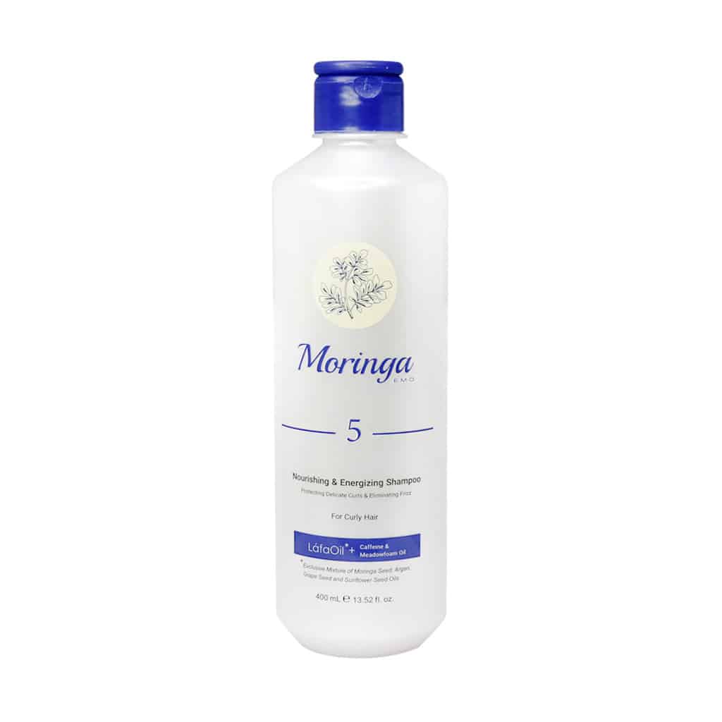 شامپو مغذی و انرژی بخش 5 مورینگا امو مناسب موهای فر خشکی و وز مو را برطرف می‌کند. در نظر داشته باشید شستشوی موها به صورت روزانه ممکن است موجب خشکی و یا مشکلات کف سر شود. کف سر نیز همانند پوست بقیه قسمت‌های بدن احتیاج به مراقبت و رسیدگی با محصولات مخصوص به خود را دارد. یکی از این محصولات شامپو است که با انتخاب و خرید شامپو مناسب پوست و نوع موی سر خود، با شستشو روزانه نه تنها آسیبی به موها و پوست وارد نمی‌کند بلکه تمیزی و سلامت آن‌ها را به دنبال دارد.