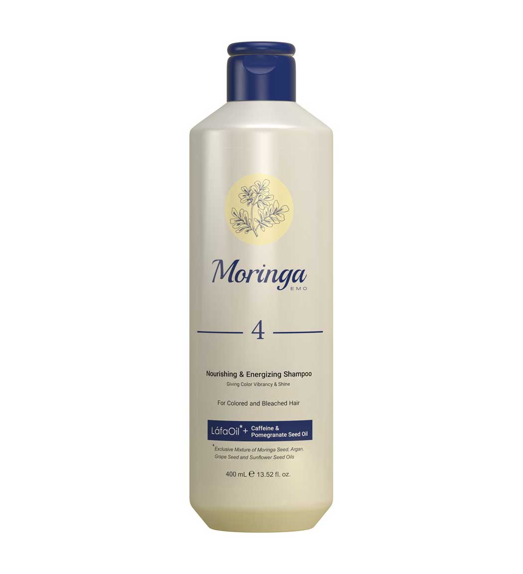 شامپو مغذی و انرژیبخش مورینگا امو 4 ضمن ترمیم و بازسازی موهای آسیبدیده، سبب تثبیت رنگ مو و افزایش درخشندگی موها میشود.