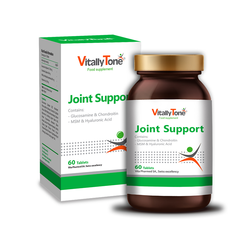 قرص جوینت ساپورت ویتالی تون به عنوان یک مکمل دارویی، دارای ترکیب مناسبی از هیالورونیک اسید، گلوکزامین و متیل سولفونیل متان است. این ترکیبات همگی در فرایند ساخته شدن طبیعی غضروف‌ها و کلاژن نقش داشته و به همین علت می‌توانند حفظ و افزایش سلامت مفاصل و استخوان‌ها را به دنبال داشته باشند. گلوکوزامین joint support از طریق تحریک تولید طبیعی غضروف در مفاصل می‌تواند محدودیت‌های حرکتی ایجاد شده در اثر استئوآرترین را بهبود بخشیده و موجب افزایش انعطاف پذیری مفاصل شود.